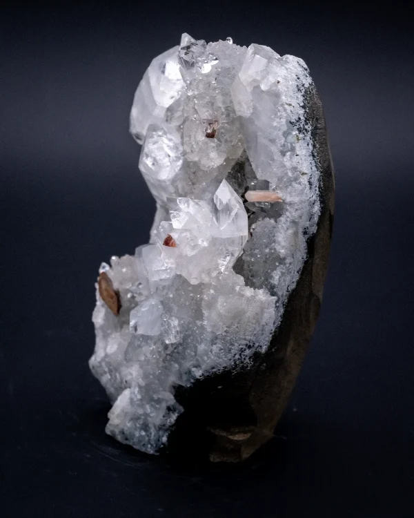 Voici une géode particulière composée de cristaux pyramidaux d’apophyllite. Certains cristaux sont de belle taille.