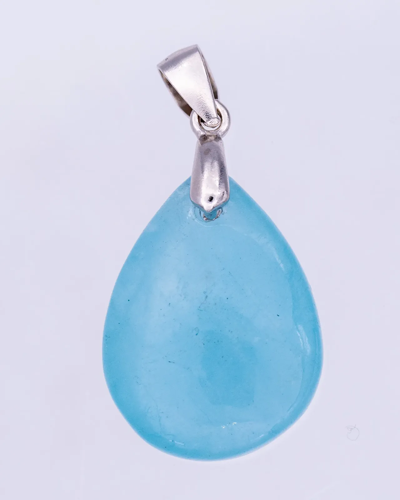 Ce pendentif d’aigue marine, une pierre précieuse d’un bleu limpide et profond, semblable à un océan paisible, à une discrète forme en poire. Sa couleur évoque la fraîcheur, la tranquillité et l’apaisement. La taille en cabochon diffuse une lumière chatoyante et hypnotique.